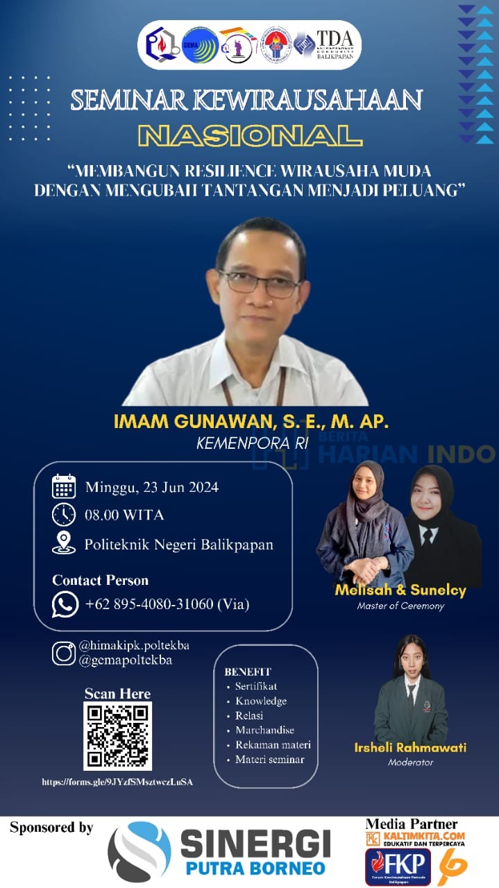 BALIKPAPAN – Pemuda Indonesia kini memiliki kesempatan langka untuk mendapatkan wawasan langsung dari para ahli dalam Seminar Kewirausahaan Nasional yang akan digelar di Gedung Terpadu Politeknik Negeri Balikpapan pada Minggu, 23 Juni 2024.